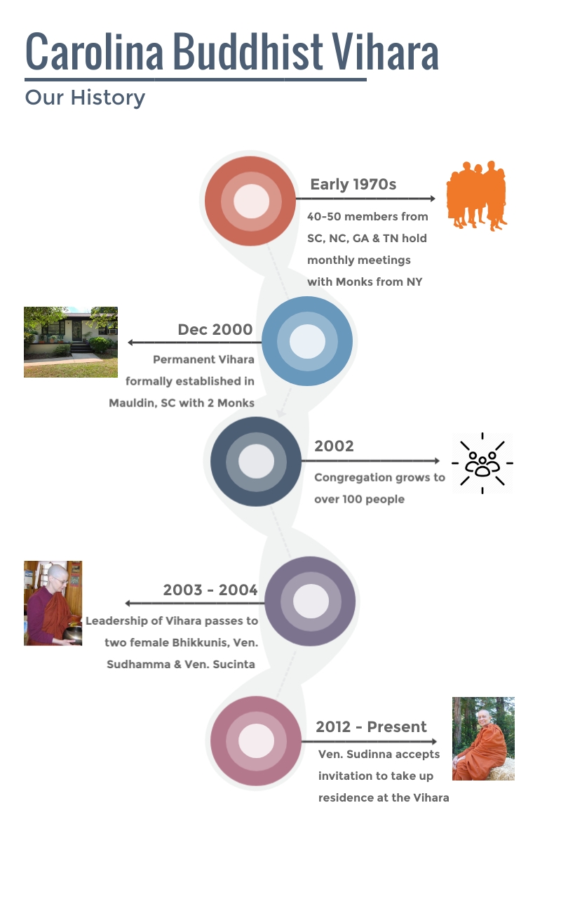 The Carolina Buddhist Vihāra was informally founded in the early 1970s with a small core group of about 40-50 members from the states of South Carolina, North Carolina, Georgia and Tennessee who met once a month in the various homes of members. On occasion, monks from New York would visit to lead the members in spiritual meditation and retreats. For these special occasions attendance at the meetings could reach upwards of 60-70 individuals. One of these New York monks, the Venerable Bhante Dhammaloka Thero, saw the need for the presence of a monastic in a fixed location in the Carolina region.